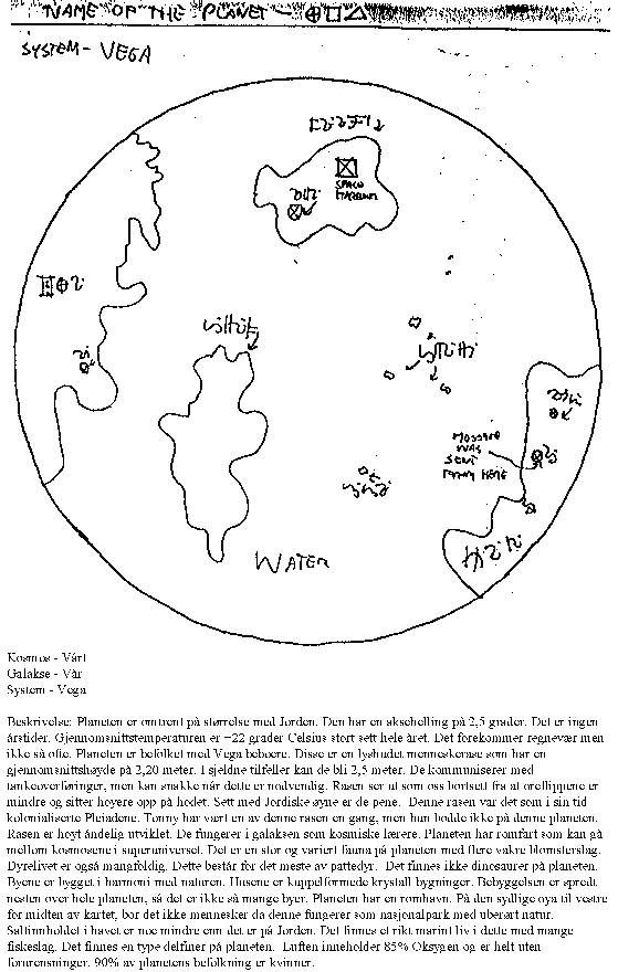Beskrivelse: Planeten er omtrent på størrelse med Jorden.Den har en aksehelling på 2,5 grader.Det er ingen årstider.Gjennomsnittstemperaturen er +22 grader Celsius stort sett hele året.Det forekommer regnevær men ikke så ofte.Planeten er befolket med Vega beboere.Disse er en lyshudet menneskerase som har en gjennomsnittshøyde på 2,20 meter.I sjeldne tilfeller kan de bli 2,5 meter.De kommuniserer med tankeoverføringer,men kan snakke når dette er nødvendig.Rasen ser ut som oss bortsett fra at øreflippene er mindre og sitter høyere opp på hodet.Sett med Jordiske øyne er de pene. Denne rasen var det som i sin tid kolonialiserte Pleiadene.(Navn 5) har vært en av denne rasen en gang,men hun bodde ikke på denne planeten. Rasen er høyt åndelig utviklet.De fungerer i galaksen som kosmiske lærere. Planeten har romfart som kan gå mellom kosmosene i superuniverset. Det er en stor og variert fauna på planeten med flere vakre blomsterslag. Dyrelivet er også mangfoldig.Dette består for det meste av pattedyr. Det finnes ikke dinosuruser på planeten.Byene er bygget i harmoni med naturen.Husene er kuppelformede krystall bygninger.Bebyggelsen er spredt nesten over hele planeten,så det er ikke så mange byer.Planeten har en romhavn.På den sydlige øya til vestre for midten av kartet,bor det ikke mennesker da denne fungerer som nationalpark med uberørt natur.Saltinnholdet i havet er noe mindre enn det er på Jorden.Det finnes et rikt marint liv i dette med mange fiskeslag.Det finnes en type delfiner på planeten. Luften inneholder 85% Oksygen og er helt uten forurensinger. 90% av planetens befolkning er kvinner.